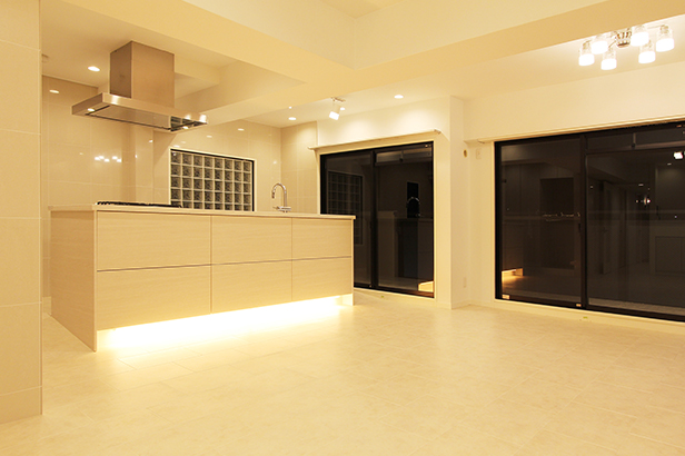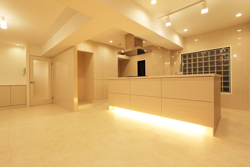 築30年ファミーリータイプマンションを全面改装。3LDKを2LD+アイランドキッチンに。配管を隠すための苦肉の策でキッチンを120mm上げてスロープをつけたのですが、それが功を奏しキッチンスタジアムのように!ホームパーティーの多いお料理好きな先輩ご夫婦に褒めていただきました。