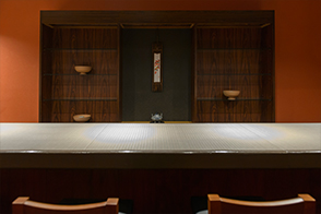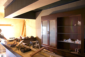 お茶屋つるやの姉妹店「かめや」の内外装をリノベーション。スナック店舗の居抜き物件を既設のカウンター、作り付けの食器棚をそのまま利用しながら和の雰囲気に低予算で仕上げました。